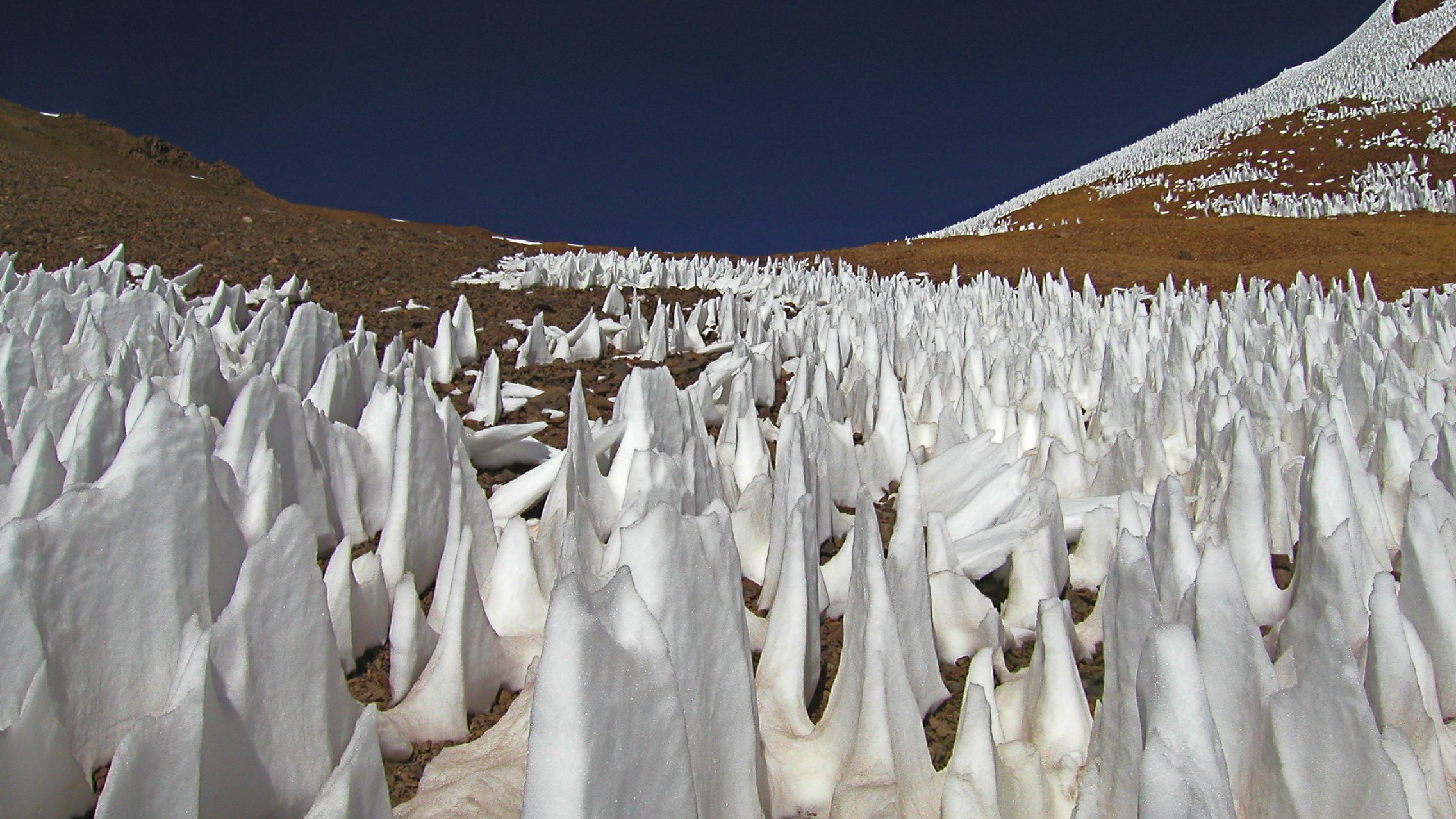 Penitentes. Under some circumstances the surface of the snow melts unevenly