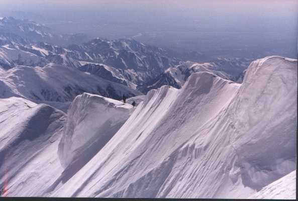 Day 10. I left for the summit from the 17,200 ft camp before everyone else, and had the mountain to myself until I met two Australians who were camping at 19,500 ft after an ascent of the West Rib. The summit ridge had a snow plume, and the Aussies warned me it could be difficult in a high wind. I climbed to the ridge, and was struck by a powerful southerly wind blowing across the ridge. After I had traversed about 50 feet of the summit ridge it became necessary to walk on top of the narrow (inches wide) snow/ice ridge. Because of the buffeting by the wind, this was too dangerous without the rope, and so I was forced to abandon the climb only 150 feet below the summit. To add to my chagrin, the wind dropped later, and when other climbers (including Pete) reached the summit ridge later in the day, it presented no difficulties.