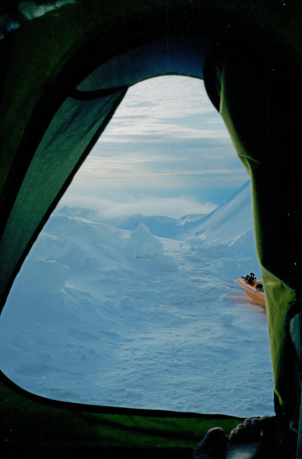 Late-evening view out my tent door at 10,500 ft. My sled is at right.
