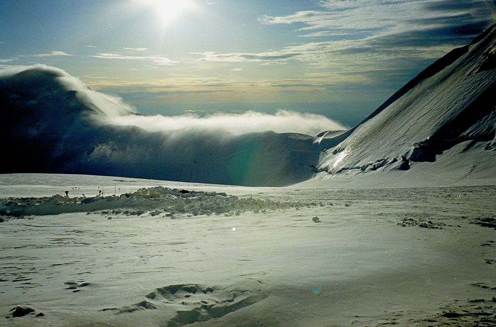 The midnight (!) setting sun, at 10,500 feet. Kahiltna Pass is at right, with cloud blowing across the ridge leading to Kahiltna Dome. At left there are some tents almost hidden by protective walls.