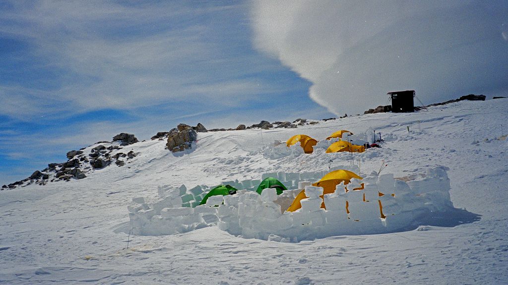An igloo at left and a tent with walls to protect it from the wind (at 14,200 ft).