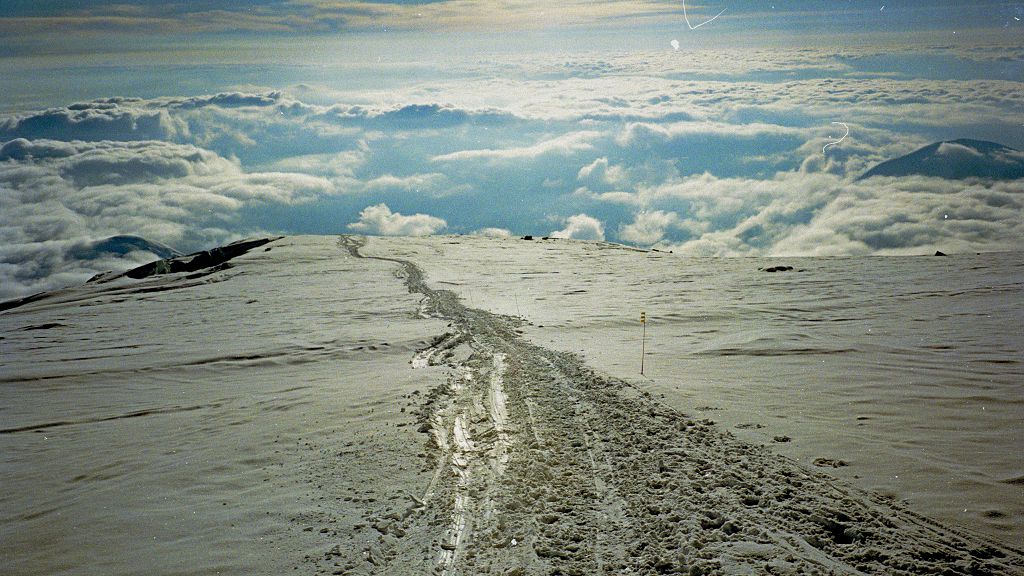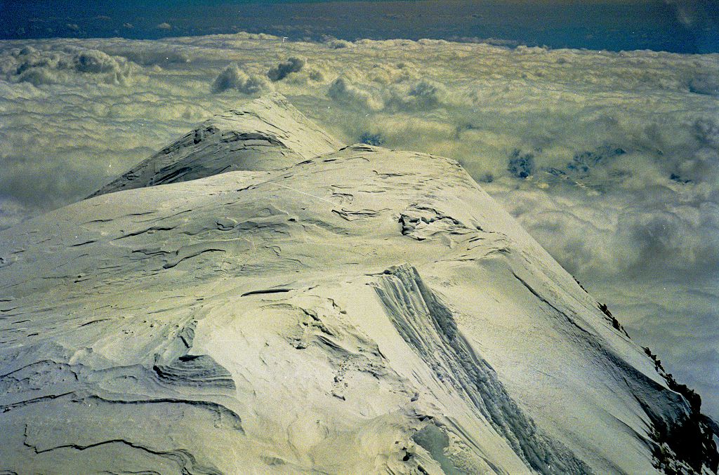 Summit ridge without snow plumes. The large flat area at 19,500 ft, known as the "football field" --- the dot at lower right on the tracks is the lone kiwi. The route climbs "pig hill" to the summit ridge, and follows it to the summit at left.