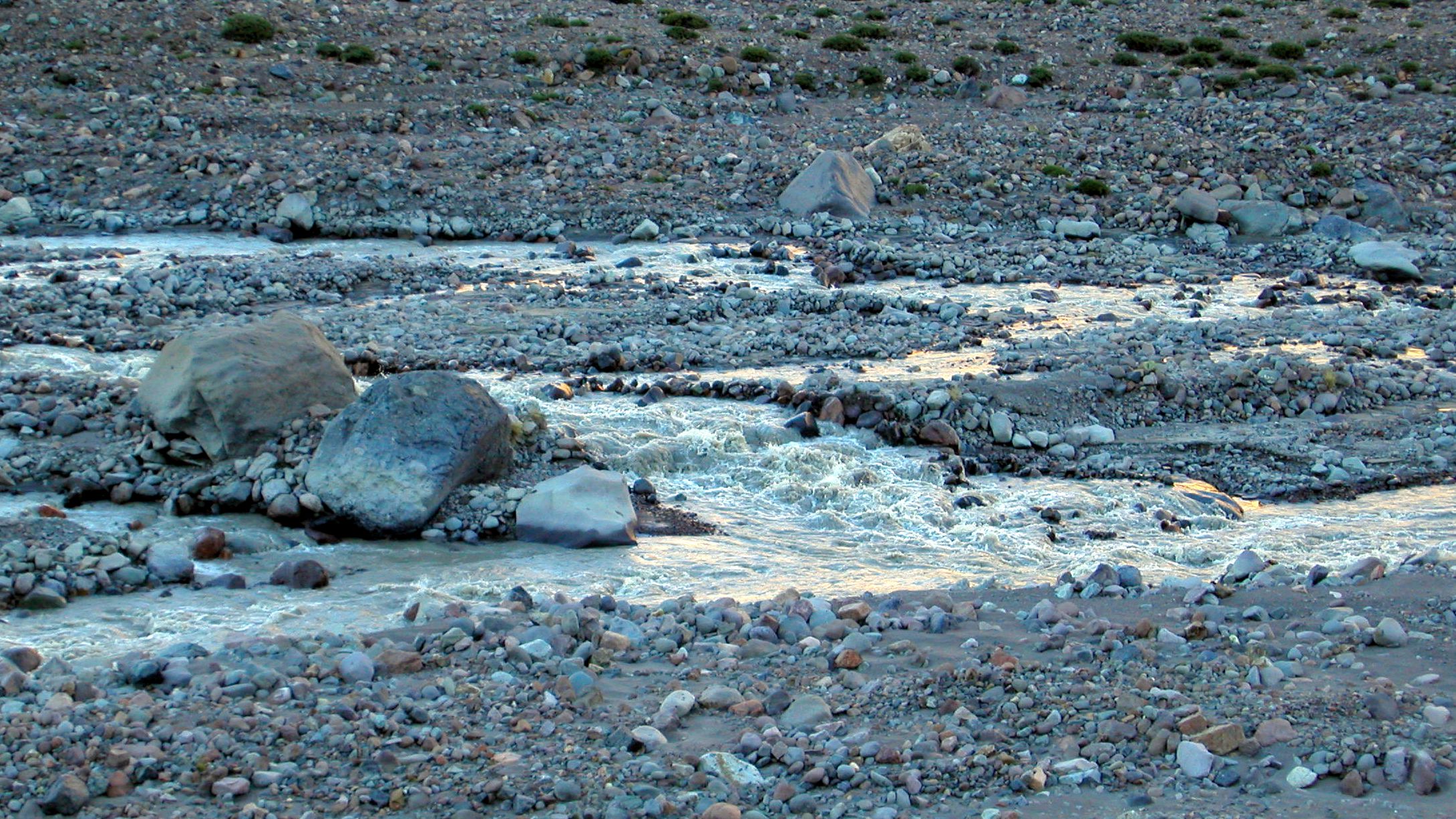 I packed and left at 6:15am, a little before it was light, in order to reach the Tupungato river before it had been swollen by the sun-melted snow. Hurried down the creek, and reached the river at 8:45am. It was a disturbing sight, but I had no choice but to cross. This time I stepped in a hole in the murky silt-laden water, and came close to being swept away.