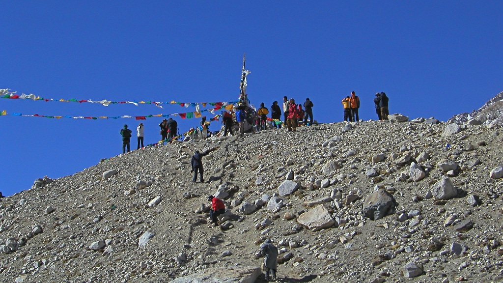 At breakfast, one of the Greeks, who is completing a Ph.D. in high-altitude physiology, was measuring the arterial oxygen saturation of his team members. He said that for acclimatized individuals at 5000m it was typically in the 70s, but for his team members and their Sherpas it was in the upper 80s. Mine was 90%. [A reading below 95% at sea level means you are gravely ill.]